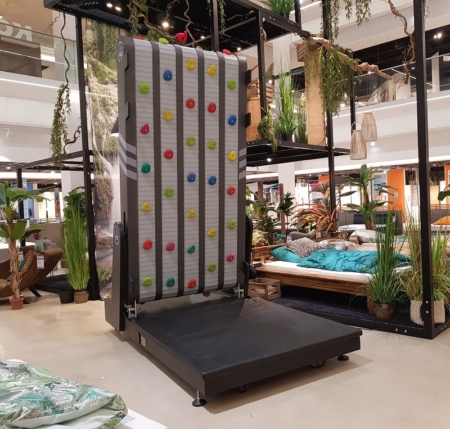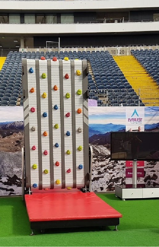 Die Geschwindigkeit passt sich automatisch Ihrem Tempo an, zusätzlich lässt sich der Neigungswinkel der Kletterwand individuelle einstellen. Somit ist es auch für Profis eine echte Herausforderung.