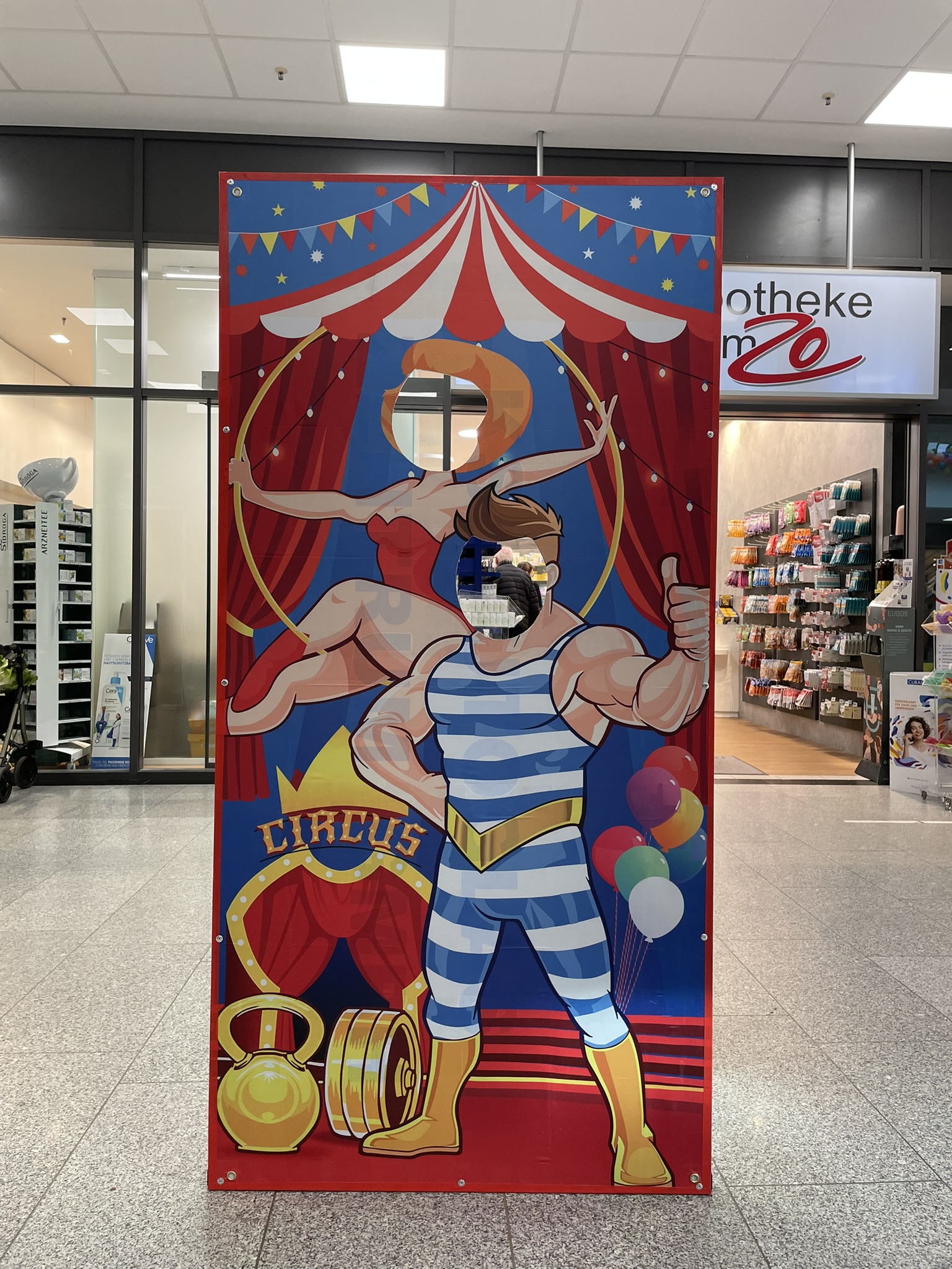 Für große Kinder und Erwachsene bietet die zweite Fotowand eine witzige Möglichkeit, sich als starker Muskelmann oder als elegante Luftartistin im Reifen zu präsentieren. Diese Kulisse garantiert lustige Schnappschüsse und jede Menge gute Laune. (Größe: Breite 90cm / Höhe 180cm / Tiefe 70 cm)