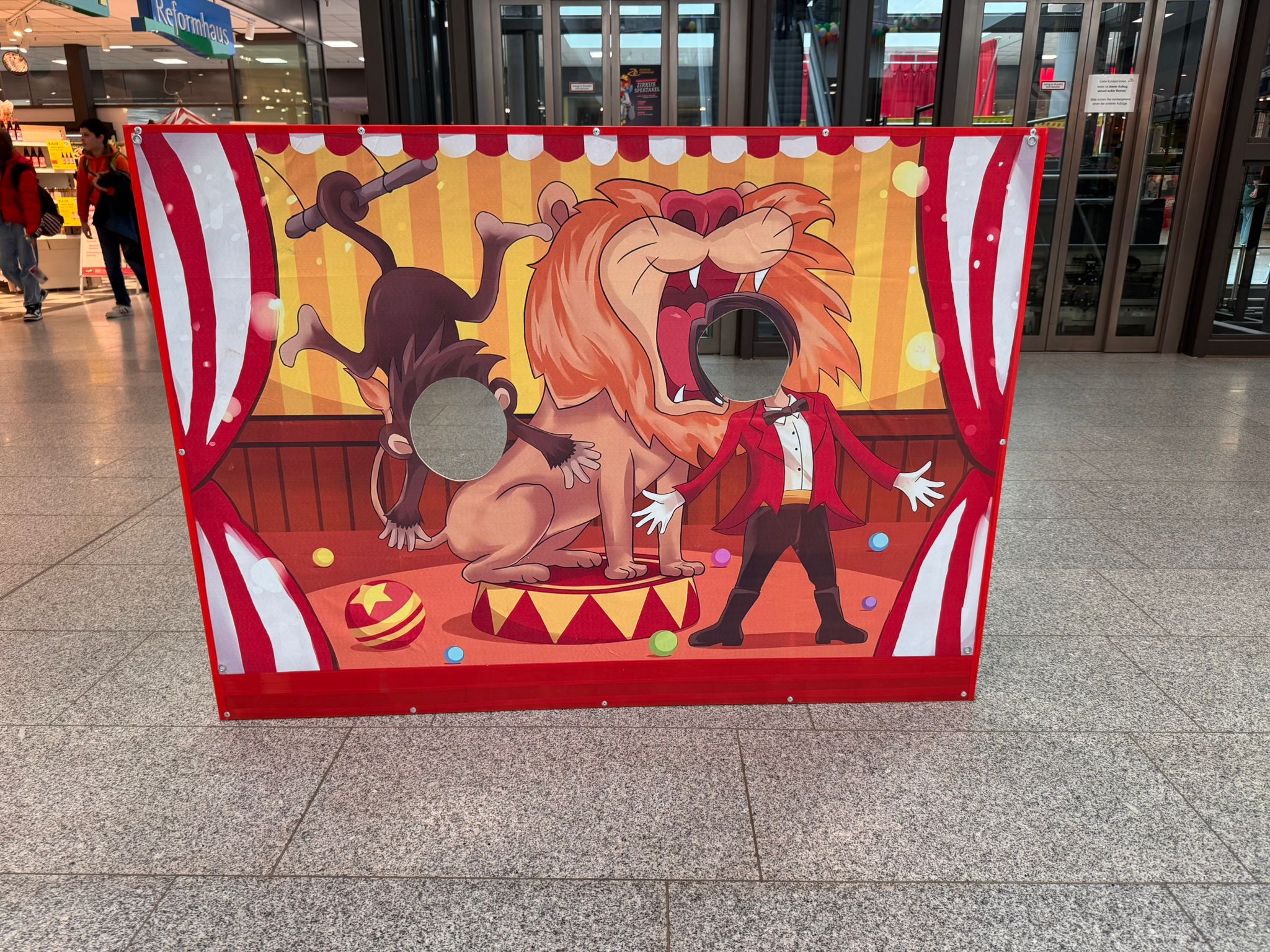 Für kleine Kinder gibt es eine Fotowand, bei der sie entweder ein mutiger Dompteur oder ein frecher Affe in einer bunten Manege sein können. Die fröhlichen Zirkusfiguren sorgen für leuchtende Augen und unvergessliche Erinnerungsfotos. (Größe: Breite 150cm / Höhe 100cm / Tiefe 70 cm)