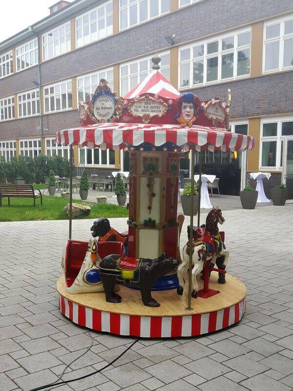 Kinderkarussell mit 8 Sitzplätzen: Ein Pferd, ein Affe, ein Elefant, ein Bär, eine doppelsitzige Nostalgiebank und ein zweisitziger Schwan
