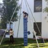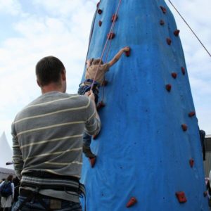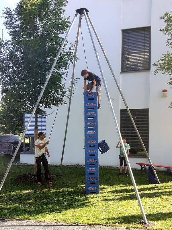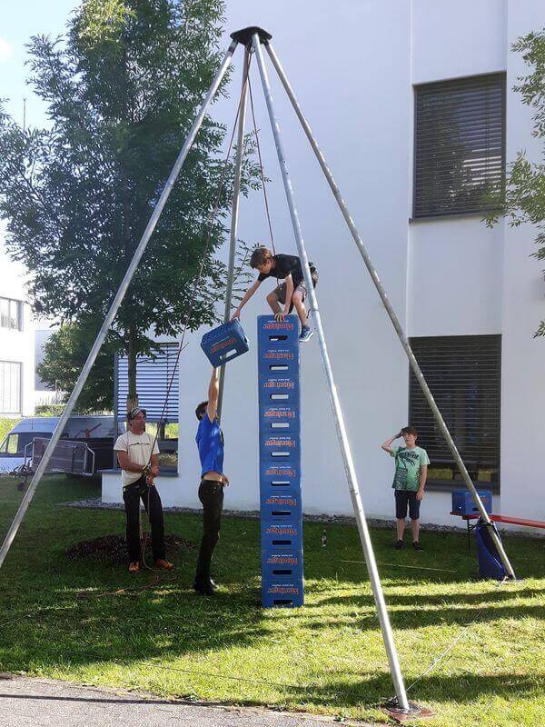 Gelingt dies nicht, hängt der Kletterer gut gesichert durch Klettergurte am Trapez des Kistenkletterturmes und wird mit Hilfe von Teammitgliedern wieder auf den Boden abgeseilt. Optional können Sie bei uns auch fachkundiges Personal zur Klettersicherung dazu buchen. Notwendig für das sichere klettern, ist auch das Anreichen der Kisten. Dieses „anreichen der Kisten“ kann bei Buchung mit Sicherungspersonal vom Anmieter selbst übernommen werden oder durch einen weiteren Eventbetreuer erfolgen.