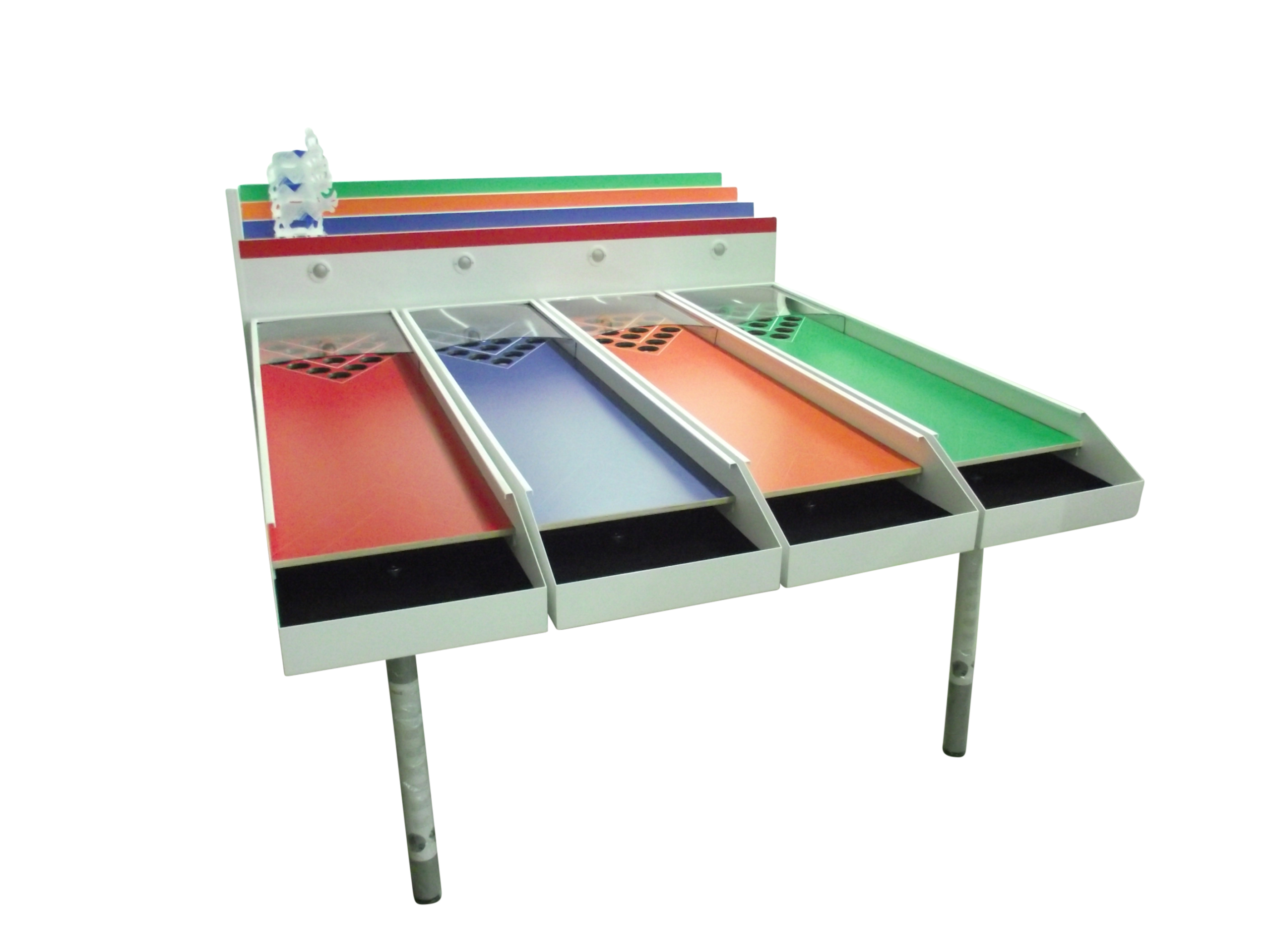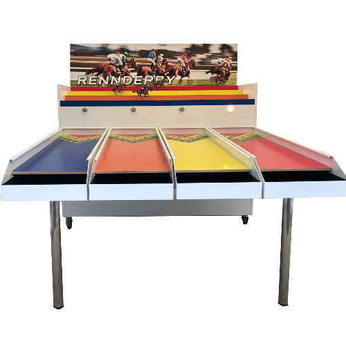 Beim Pferdederby mit 4 Bahnen treten bis zu vier Spieler gleichzeitig gegeneinander an. Durch gezieltes Rollen der Bälle in die vorgesehenen Löcher bewegt sich das jeweilige Pferd Schritt für Schritt nach vorne. Wer Präzision und Tempo am besten kombiniert, gewinnt das Rennen. Das leicht verständliche Spielprinzip sorgt für schnelle Runden, hohe Spannung und jede Menge Spaß für Teilnehmer und Zuschauer – ideal für Events aller Art.