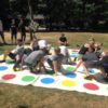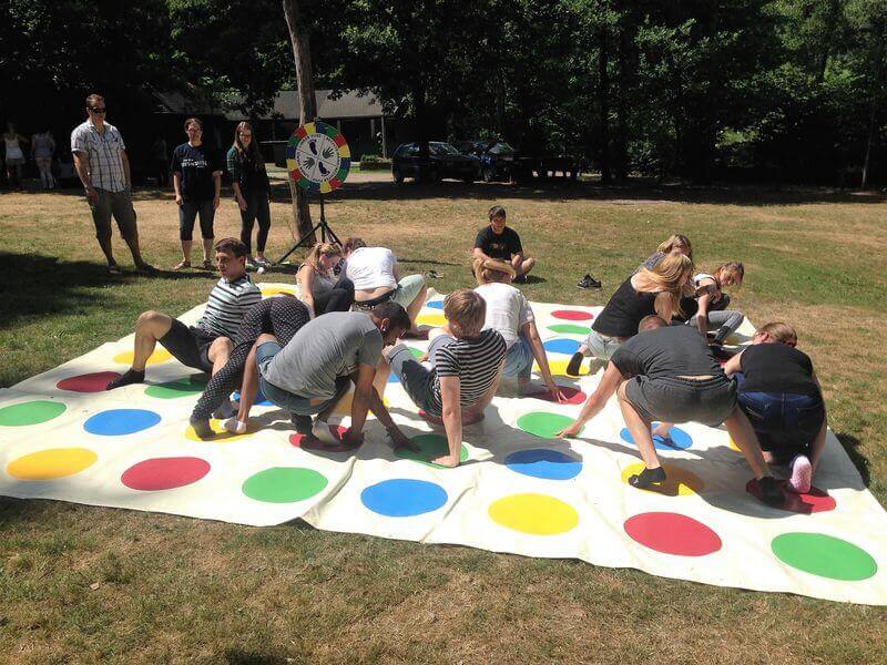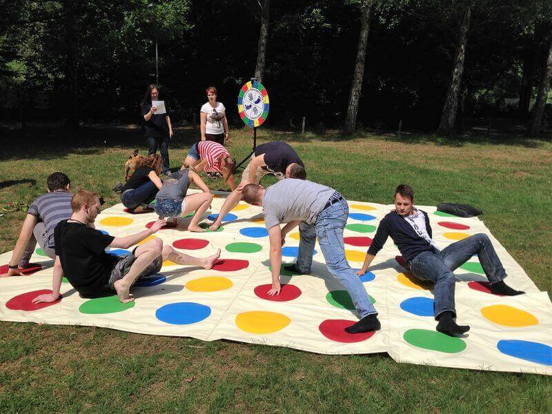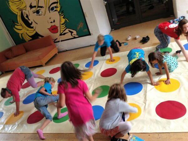 Beim XXL-Twister ist das Spielfeld mit den blauen, roten, grünen und gelben Punkten 5 x 4 m groß.